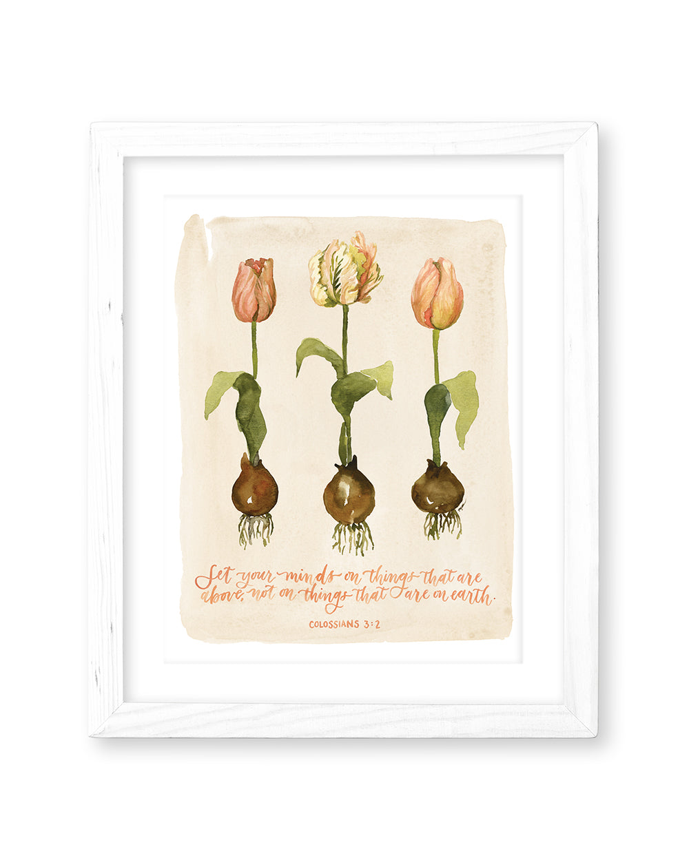 This reproduction of an original hand painted, hand lettered watercolor painting by Ruth Chou Simons is professionally printed on heavy textured card stock and comes backed with chipboard in a sealed protective sleeve.