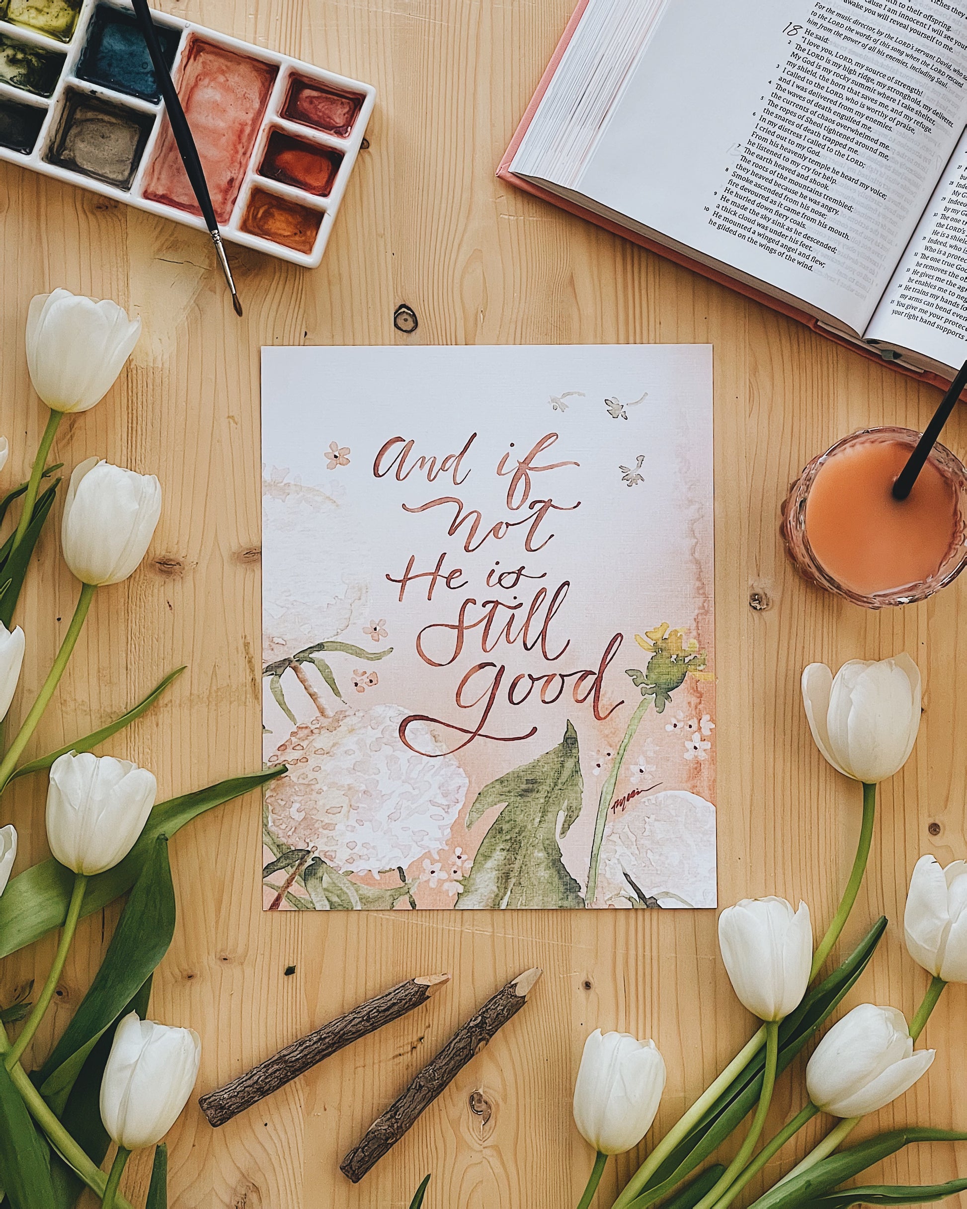 This reproduction of an original hand painted, hand lettered watercolor painting by Ruth Chou Simons is professionally printed on heavy textured card stock and comes backed with chipboard in a sealed protective sleeve.