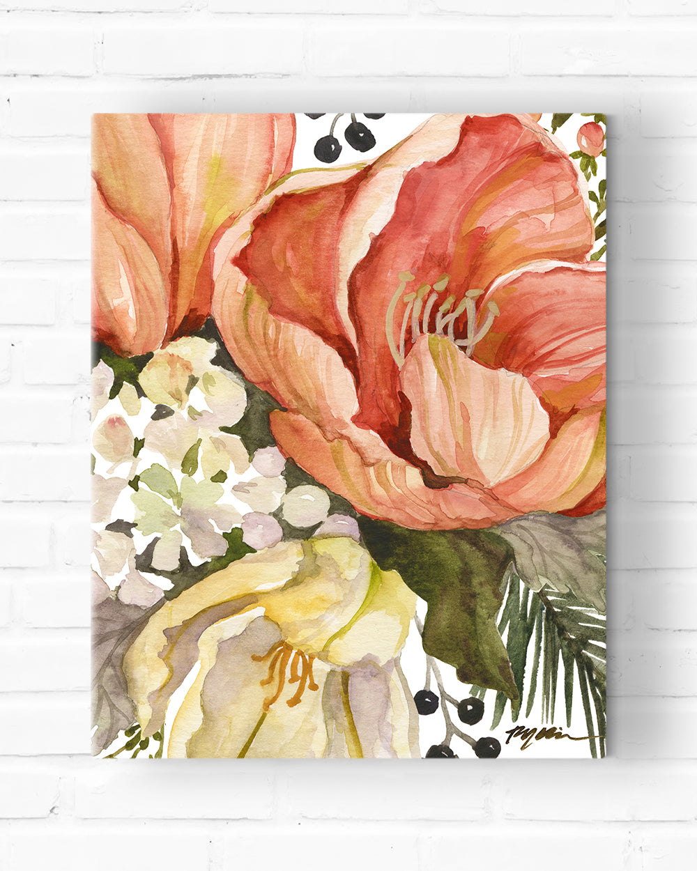 This reproduction of an original hand painted, hand lettered watercolor painting by Ruth Chou Simons is printed on a professional quality gallery-wrapped canvas with solid backing. It comes ready to hang and does not require framing.