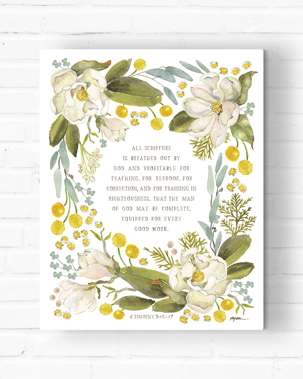 This reproduction of an original hand painted, hand lettered watercolor and gouche painting by Ruth Chou Simons is printed on a professional quality gallery-wrapped canvas with solid backing. It comes ready to hang and does not require framing.