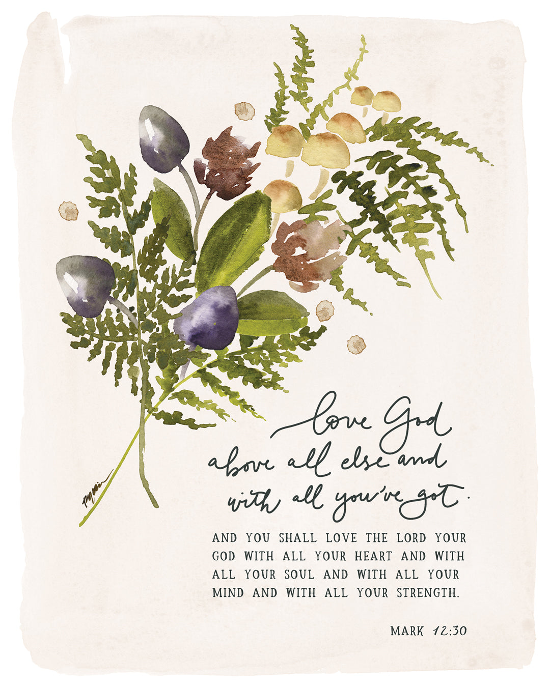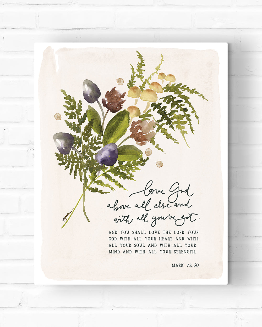 This reproduction of an original hand painted, hand lettered watercolor painting by Ruth Chou Simons is printed on a professional quality gallery-wrapped canvas with solid backing. It comes ready to hang and does not require framing.