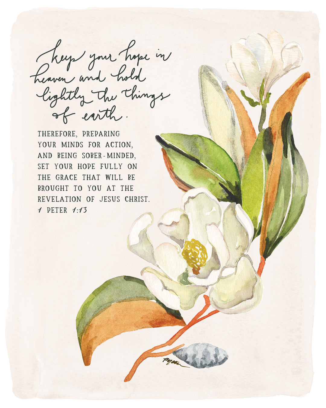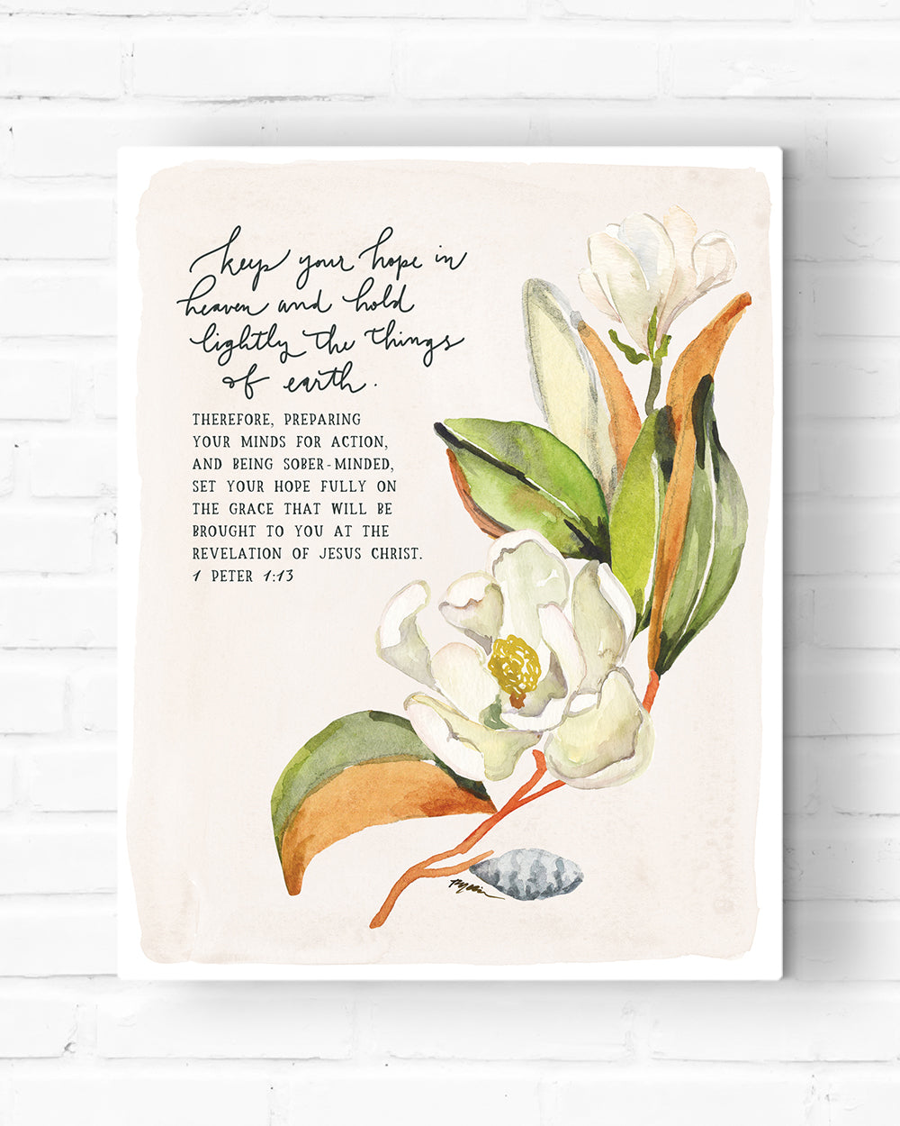 This reproduction of an original hand painted, hand lettered watercolor painting by Ruth Chou Simons is printed on a professional quality gallery-wrapped canvas with solid backing. It comes ready to hang and does not require framing.