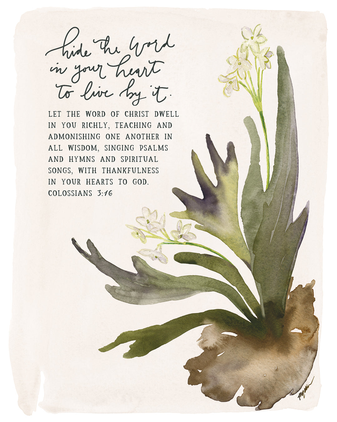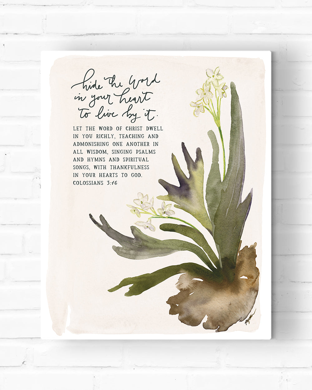 This reproduction of an original hand painted, hand lettered watercolor painting by Ruth Chou Simons is printed on a professional quality gallery-wrapped canvas with solid backing. It comes ready to hang and does not require framing.