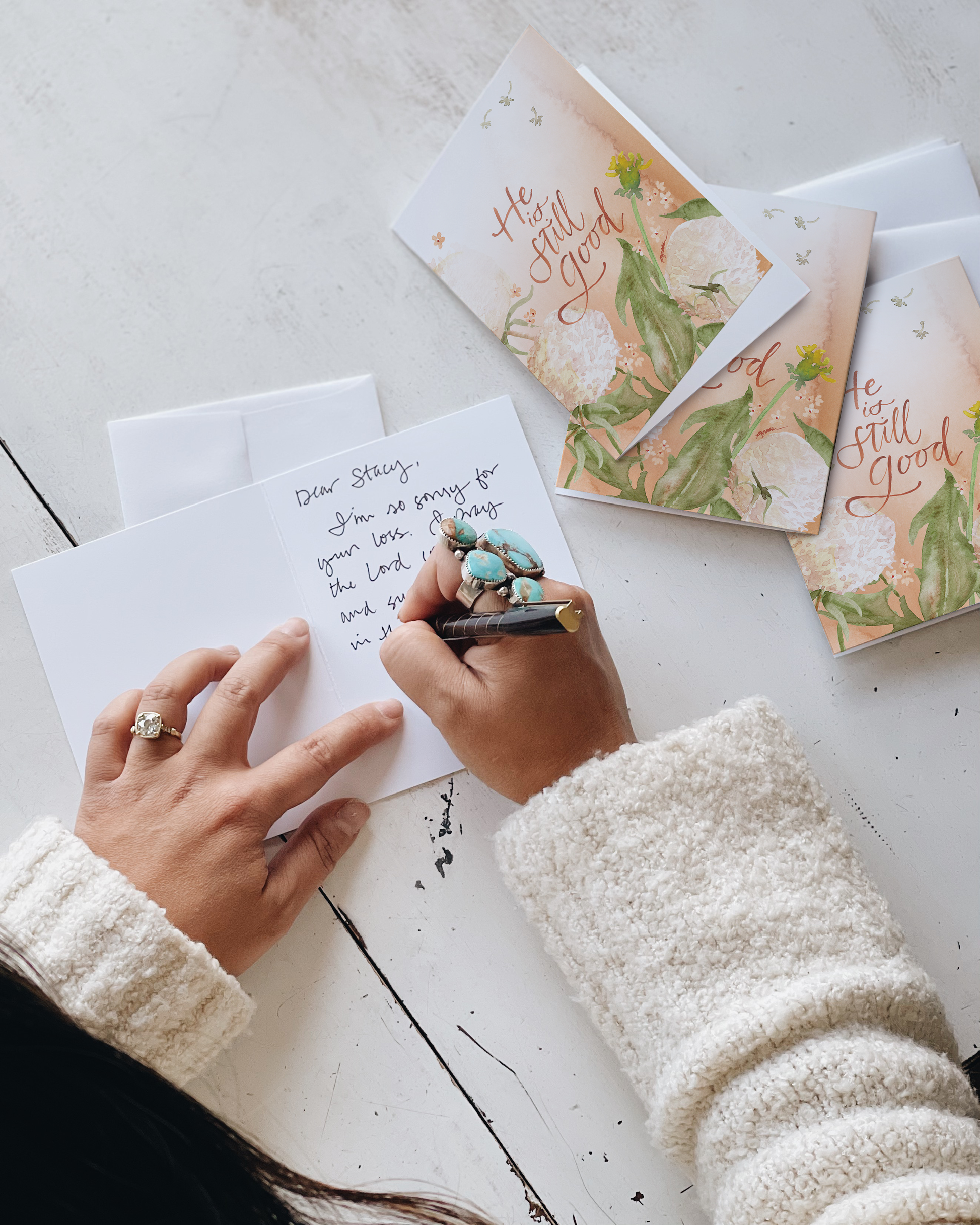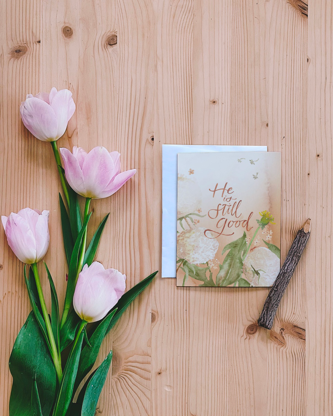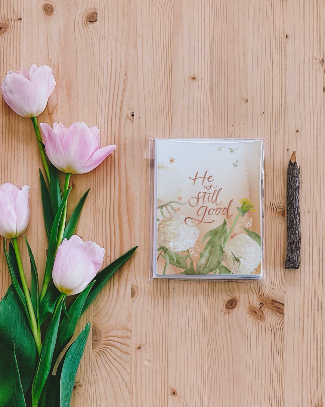 Each 4.25" x 5.5" folded notecard is printed on fine white card stock and comes with a plain white envelope. There are 8 folded notecards within each set. This print is a reproduction of hand-lettered, watercolor artwork painted by Ruth Chou Simons. These cards are perfect for a handwritten note.