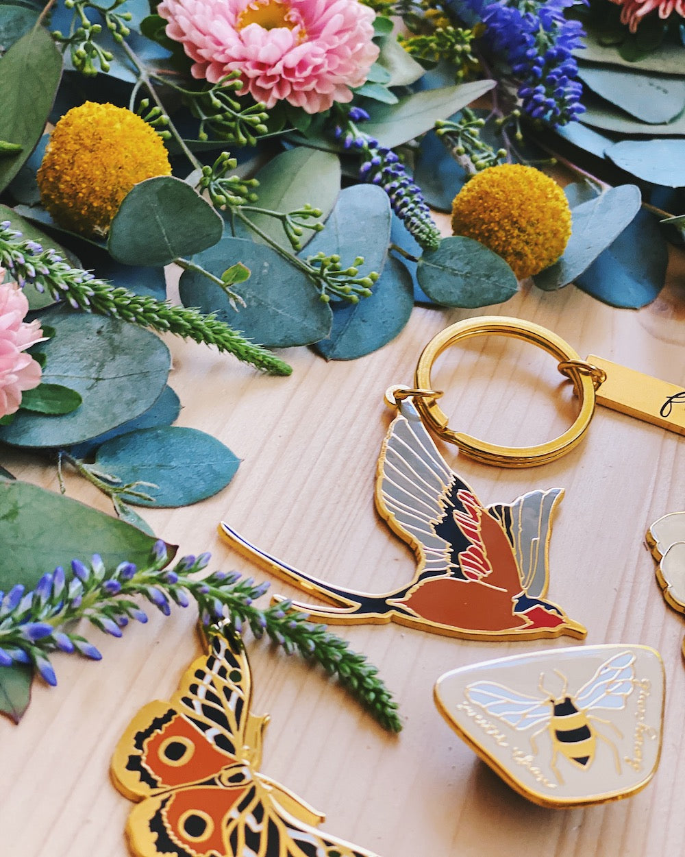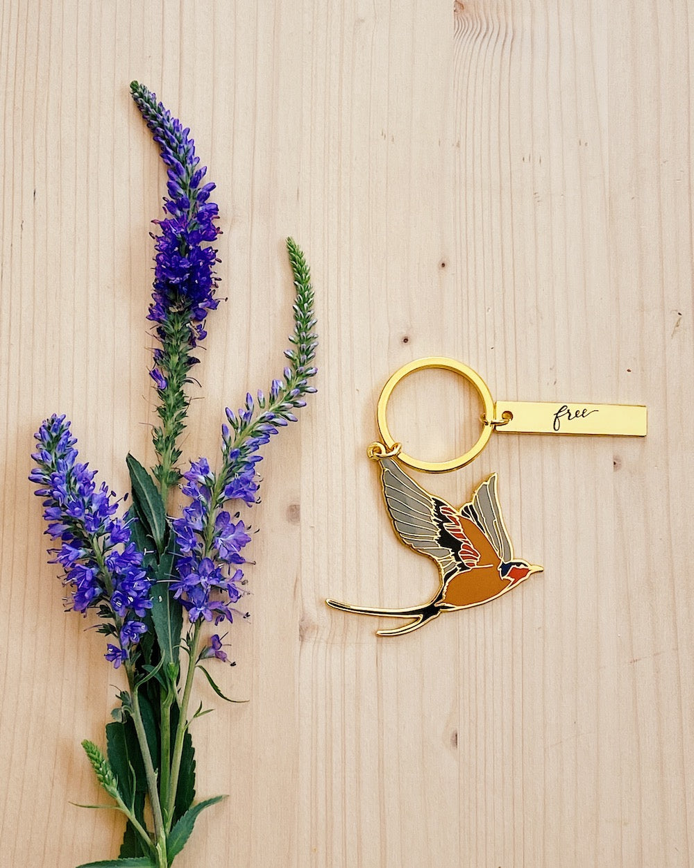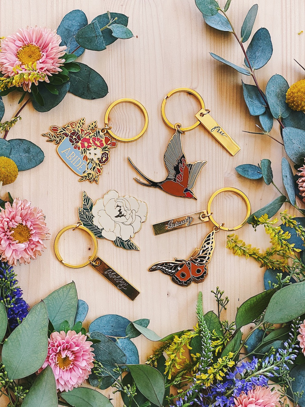 This glossy enamel keychain features art with an encouragement to carry on your way.