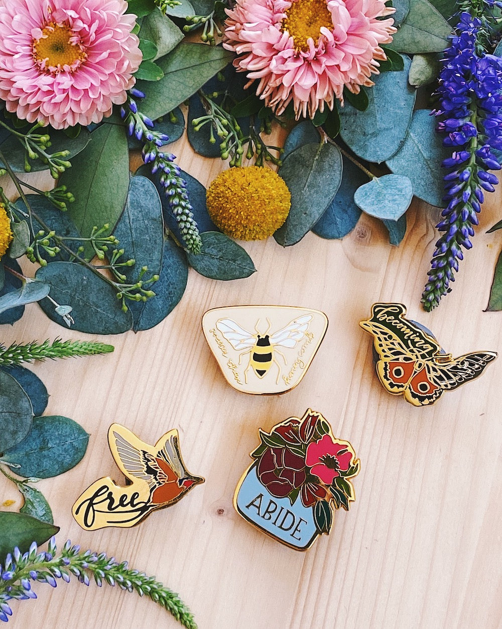 Each pin is backed with a butterfly clutch backing to hold it securely in place. Each pin is 1" wide and 1.25” long.