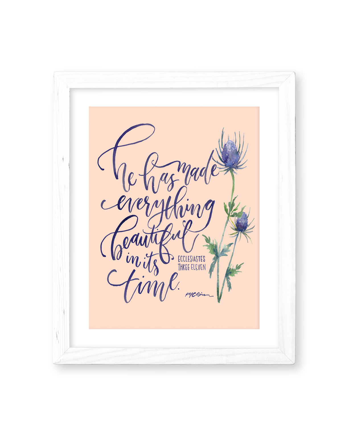 This reproduction of an original hand painted, hand lettered watercolor and gouche painting by Ruth Chou Simons is professionally printed on heavy textured card stock and comes backed with chipboard in a sealed protective sleeve.