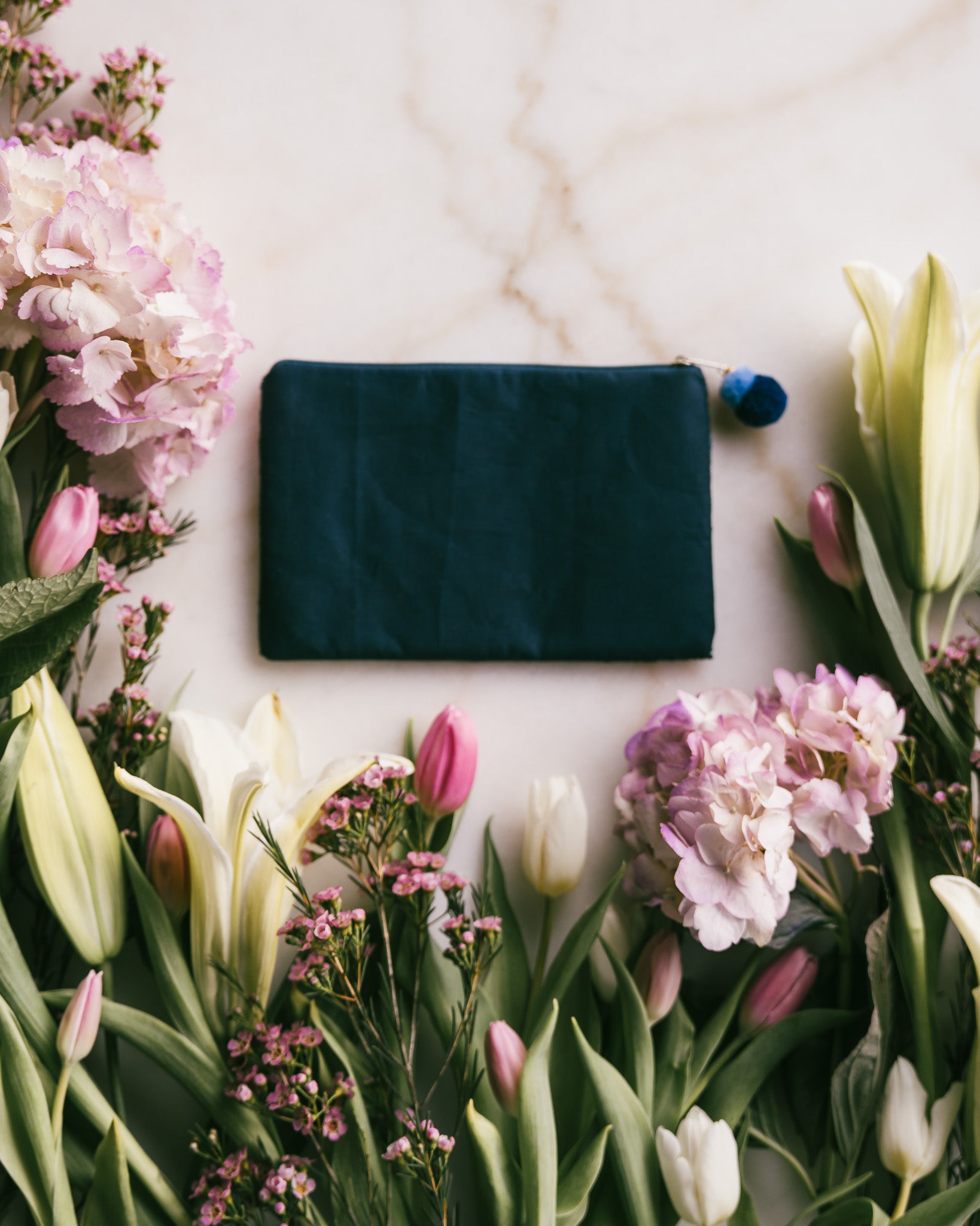 This chic handmade beaded pouch features a beautiful design based on hand drawn artwork by Ruth Chou Simons featuring anemones.