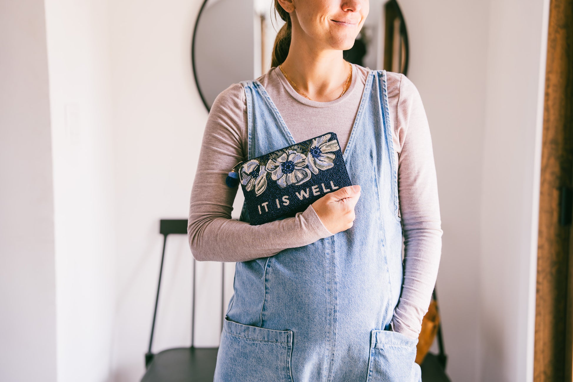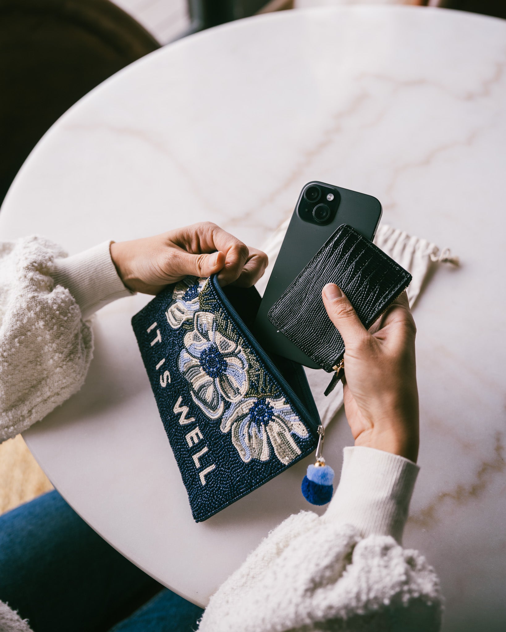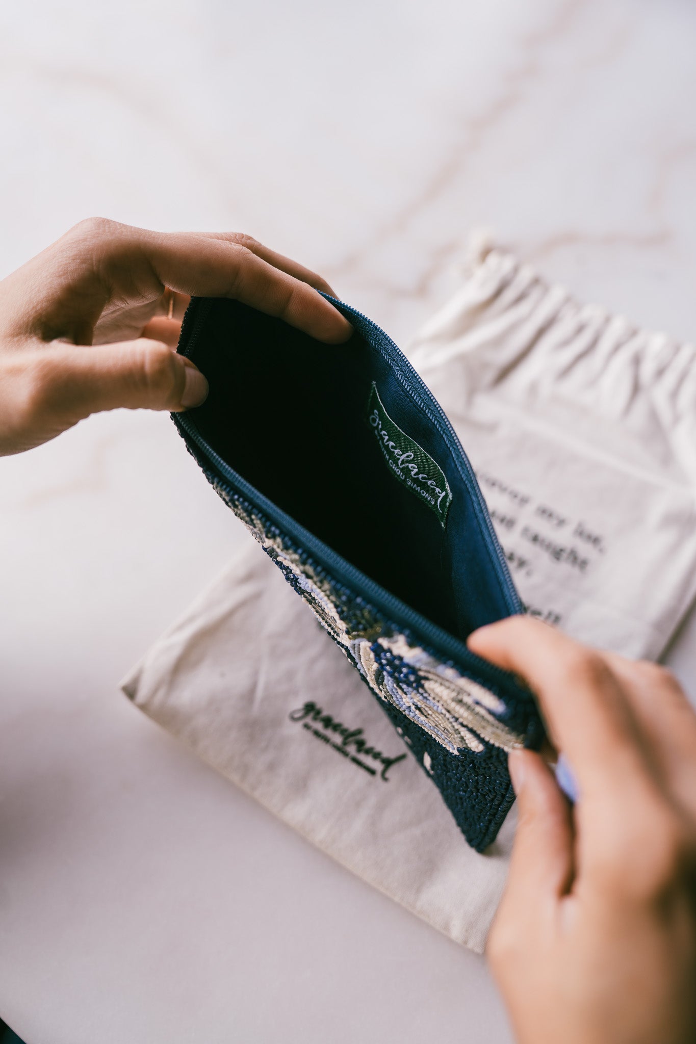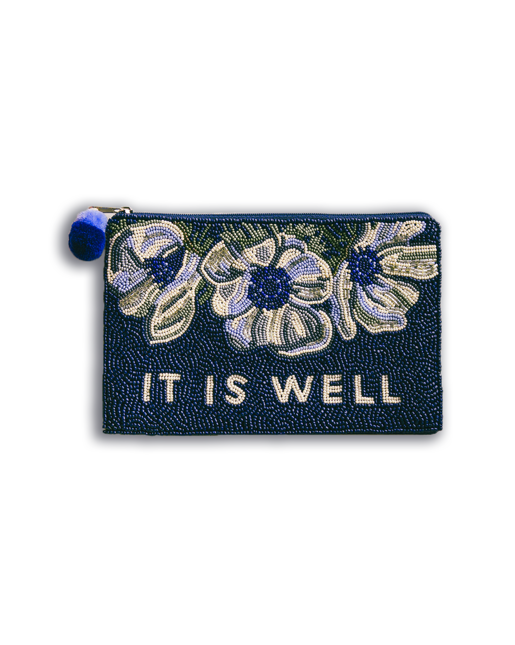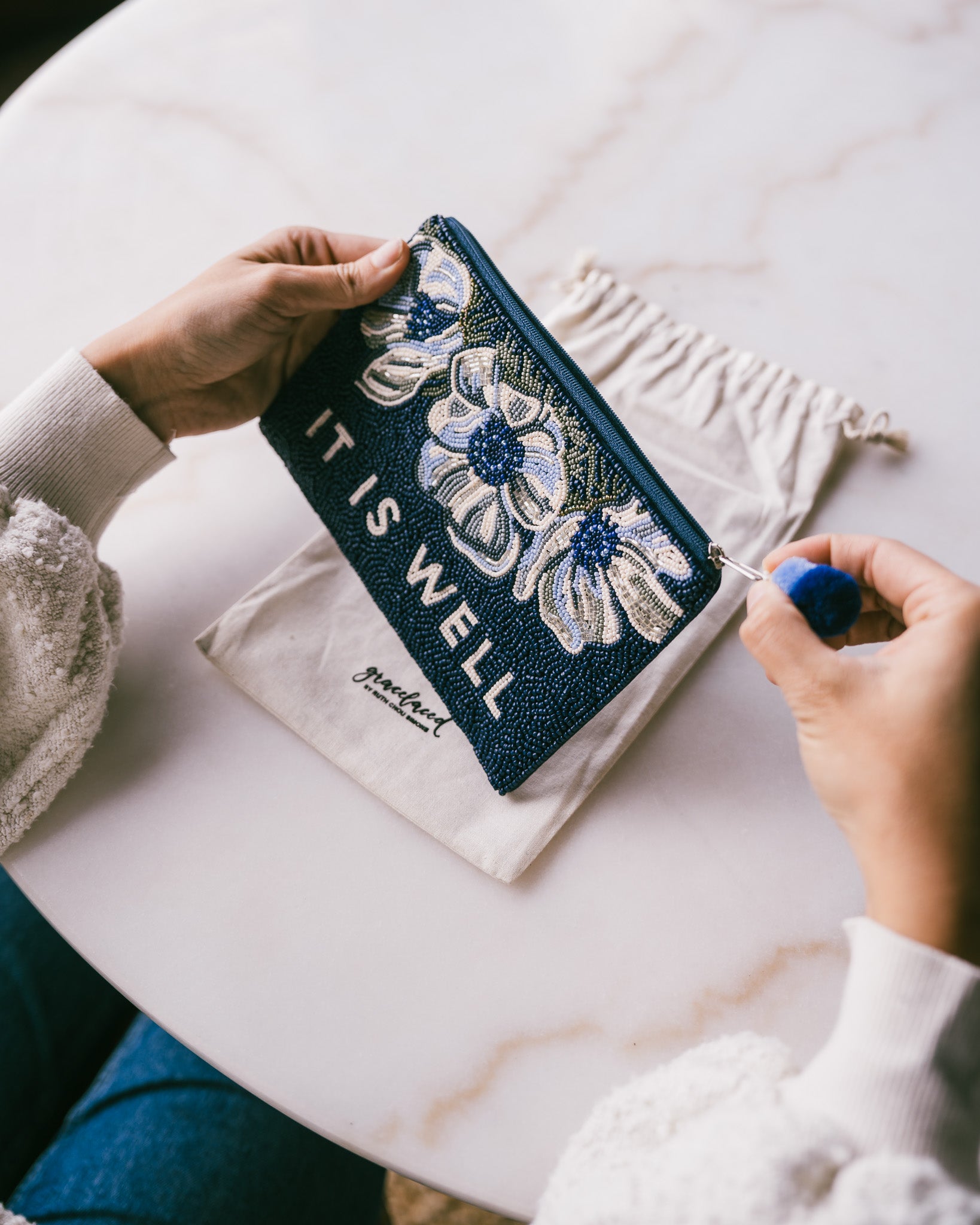 This 8"L x 5"H beaded pouch includes a pompom zipper closure, lined interior, and muslin storage pouch.